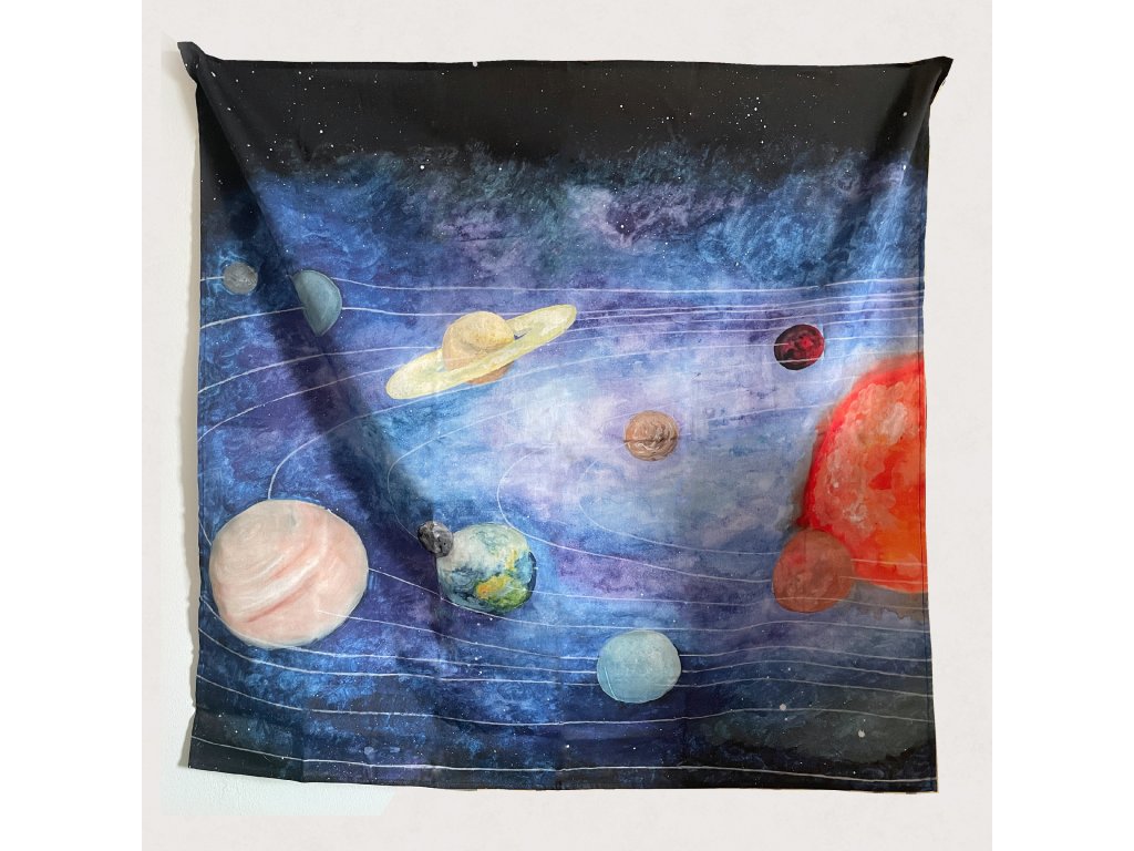 Motív na šatke je autorský originál ručne maľovaný akvarelom a následne tlačený na 100% bavlnenú textíliu. Farby sú následne zafixované do textílie, čo zaručuje ich odolnosť. Potlač je certifikovaná a bezpečná aj pre najmenších.