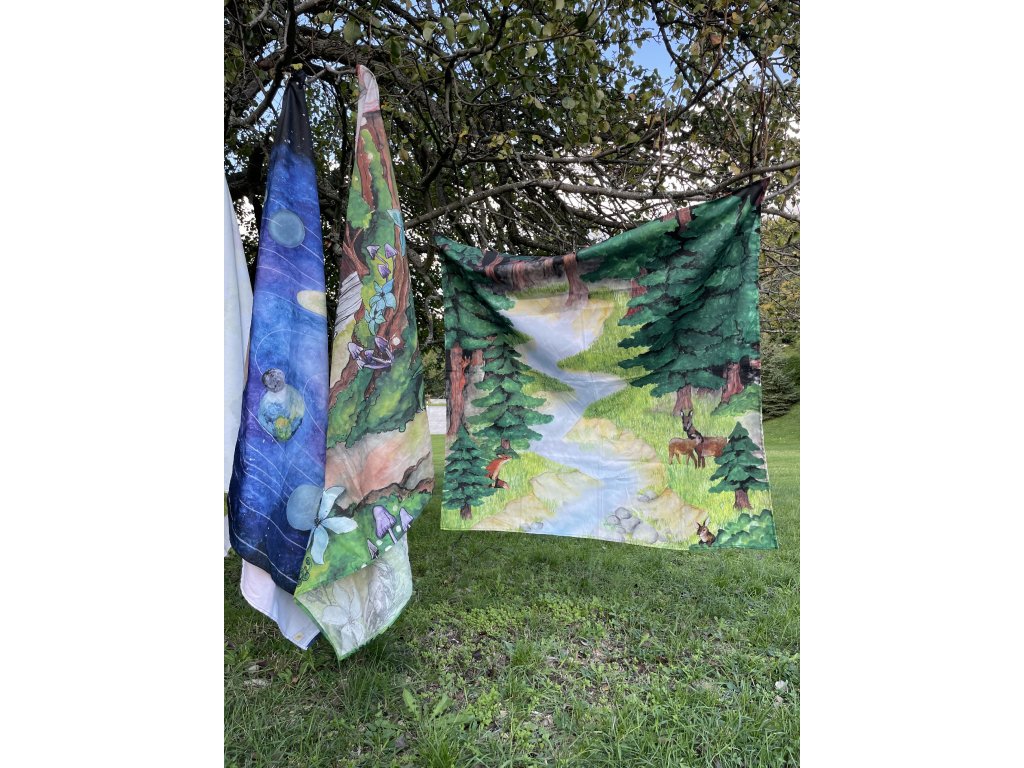 Motív na šatke je autorský originál ručne maľovaný akvarelom a následne tlačený na 100% bavlnenú textíliu. Farby sú následne zafixované do textílie, čo zaručuje ich odolnosť. Potlač je certifikovaná a bezpečná aj pre najmenších.