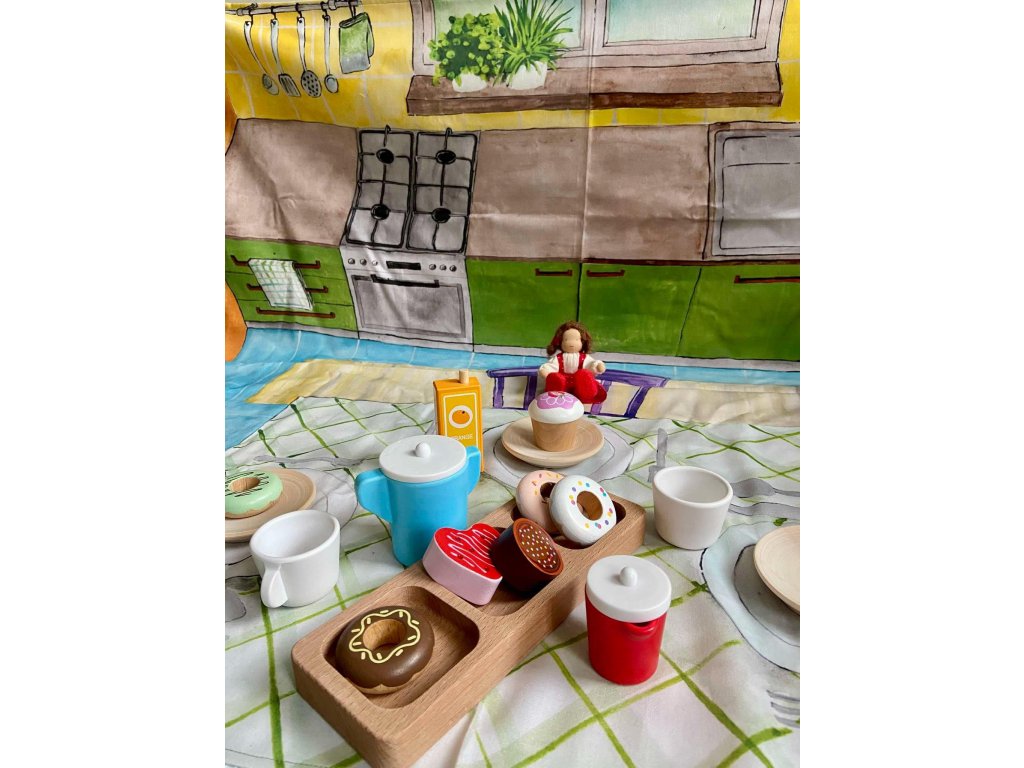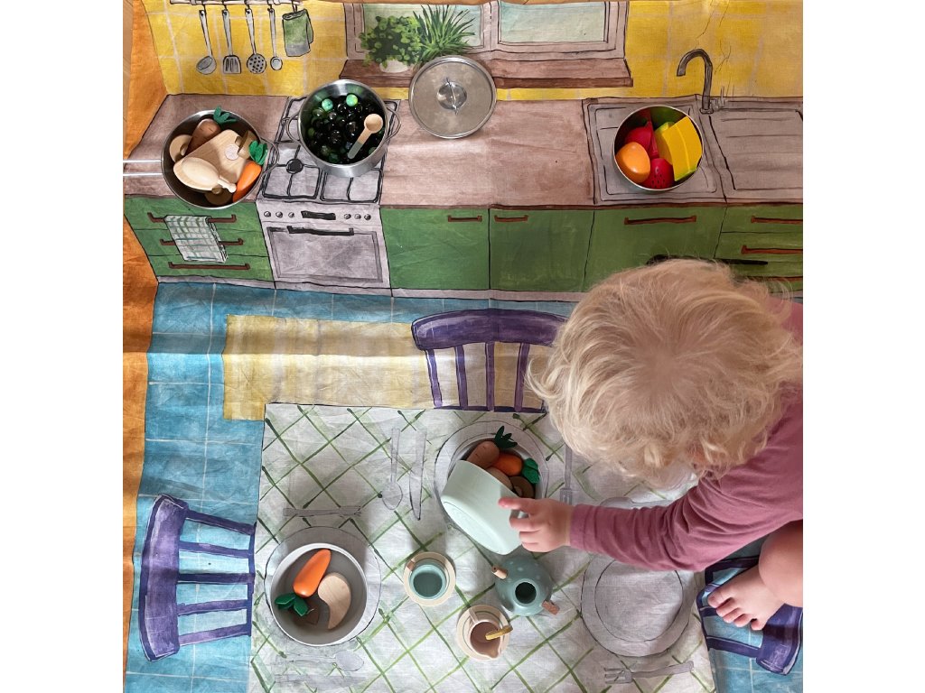 Zo zadnej strany sú v hornej časti našité dve ušká, takže si šatku môžete zavesiť na stenu ako dekoráciu, alebo ju upevniť pri hre ako zavesené pozadie. Nechýba ani štítok s inštrukciami na pranie.