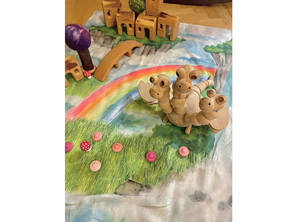 Zo zadnej strany sú v hornej časti našité dve ušká, takže si šatku môžete zavesiť na stenu ako dekoráciu, alebo ju upevniť pri hre ako zavesené pozadie. Nechýba ani štítok s inštrukciami na pranie.